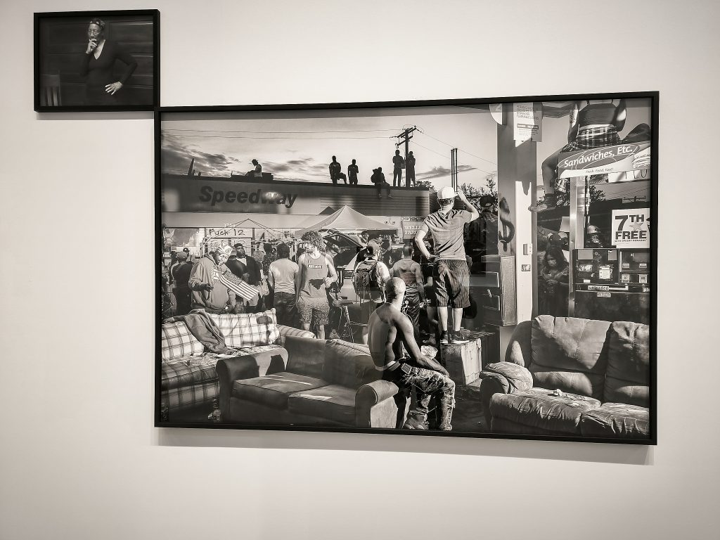 Speedway, George Floyd Square, Minneapolis, Minnesota, June 2020 lautet der Titel des größeren Fotos. Auch wenn sich die Proteste gegen rassistische Gewalt und für Gleichberechtigung nach dem Mord an George Floyd durch Derek Chauvin , einen weißen Polizisten, weltweit ausbreiteten, blieb die Verkehrskreuzung, an der er in Minneapolis starb, das Epizentrum der Bewegung. Demonstrant*innen besetzten den Bereich monatelang, auch während des Prozesses gegen Chauvin, in dem er im April 2021 für schuldig befunden wurde. Montgomery belichtet die Details dieses Versammlungsortes, an dem Menschen sich auf Sofas ausruhen, sowie das Dach der Speedway-Tankstelle auf der anderen Straßenseite, wo die Tage seit Floyds Tod gezählt wurden.