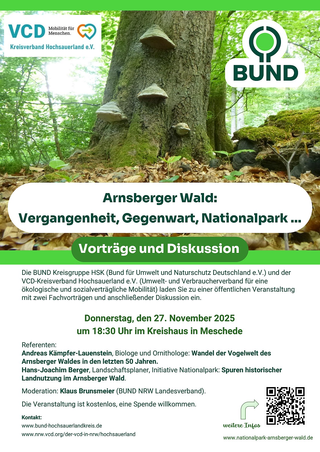 Auch wenn noch nicht alles optimal ist, stellt der Arnsberger Wald bereits in seiner jetzigen Ausprägung das Juwel im Westfälischen Waldmeer dar. Ein Nationalpark würde ihm den passenden Schliff verleihen. In der anschließenden Diskussion soll erörtert werden, wie ein Nationalpark auf den Landesflächen im Naturpark realisiert werden kann.