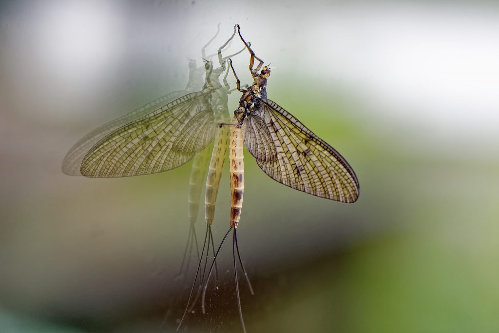 Die Große Eintagsfliege spiegelt sich im Fenster und wartet auf eine Lebenspartnerin. Das sieht eitel aus, aber welche Gefühle kann eine Eintagsfliege schon haben? Immerhin war sie Insekt des Jahres 2021.