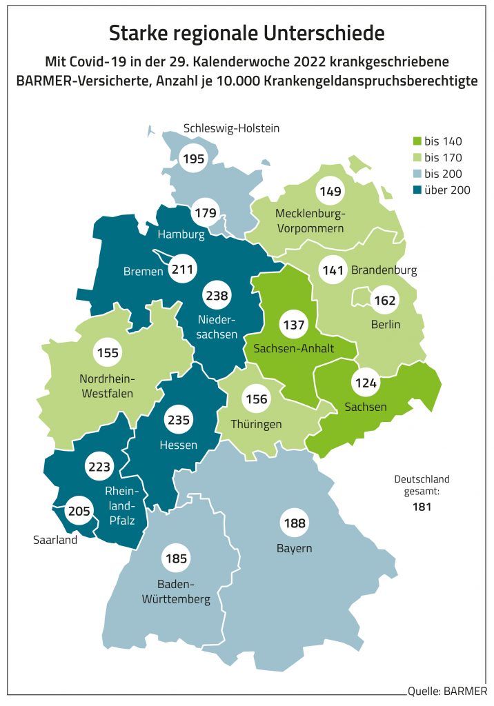 Wie aus der Analyse weiter hervorgeht, gibt es massive regionale Unterschiede bei der Rate der Krankschreibungen mit einer Covid-19-Infektion. Zuletzt war Niedersachsen am stärksten betroffen. Hier lag die Anzahl der Krankschreibungen mit Corona zwischen dem 17. und 23. Juli deutlich über dem Bundesdurchschnitt (238 vs. 181 je 10.000 Krankengeld-Anspruchsberechtigte).