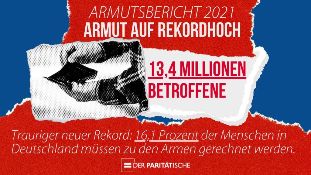 Laut aktuellem Paritätischen Armutsbericht hat die Armutsquote in Deutschland mit 16,1 Prozent (rechnerisch 13,4 Millionen Menschen) im Pandemie-Jahr 2020 einen neuen Höchststand erreicht.