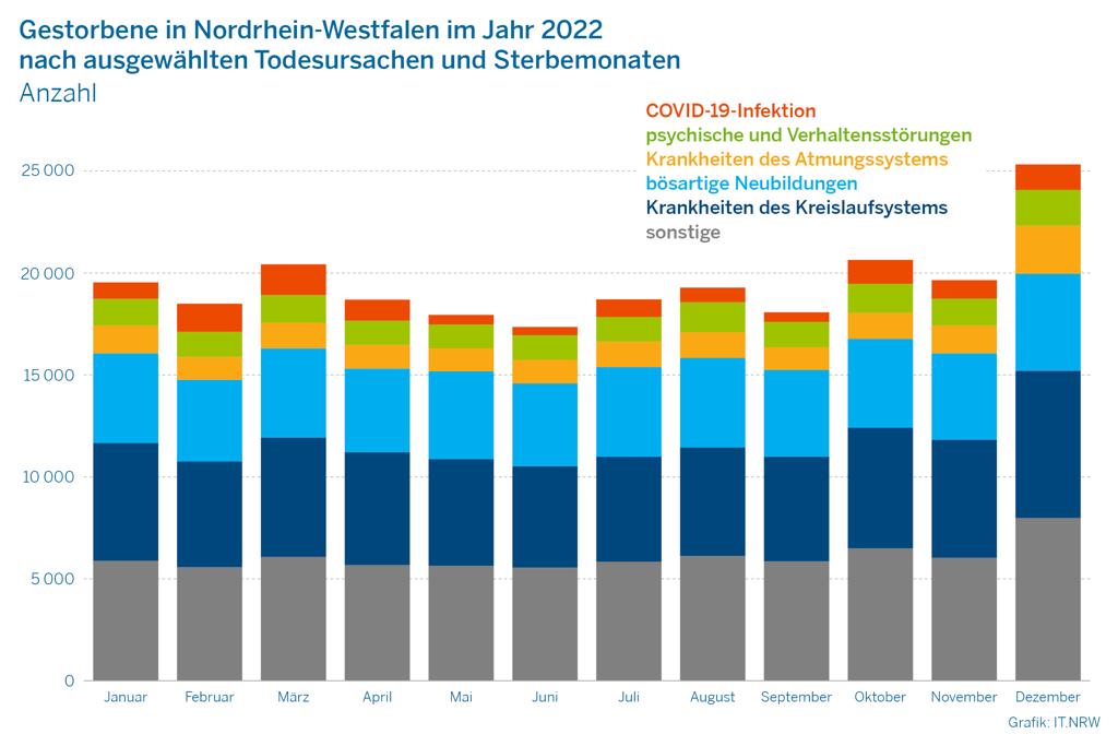 Die Betrachtung der Sterbefälle nach Sterbemonat zeigt einen überdurchschnittlichen Anstieg (+28,9 Prozent) der Todesfälle im Dezember 2022 (25 333 Fälle) gegenüber dem Vormonat (November 2022: 19 653 Fälle). Im Durchschnitt der Jahre 2017 bis 2021 hatte dieser Zuwachs bei 10,9 Prozent gelegen. Im Vergleich zu November 2022 sind die Todesfälle im Dezember in allen Todesursachengruppen gestiegen. Den höchsten Anstieg hat das Statistische Landesamt hier bei den Todesfällen aufgrund von Krankheiten des Atmungssystems (+72,8 Prozent; +997 Todesfälle) ermittelt.