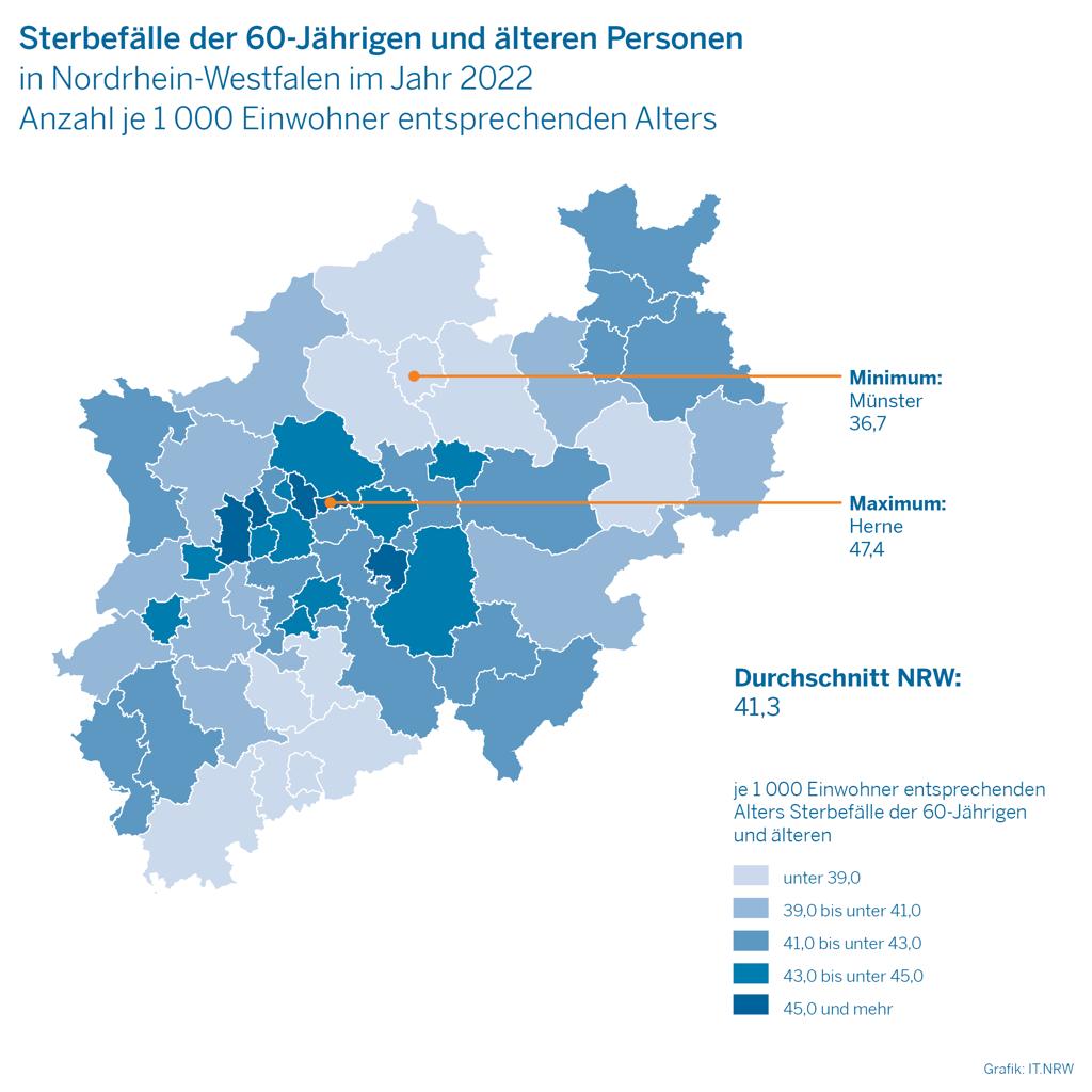 In den Kreisen und kreisfreien Städten des Landes NRWs waren im Jahr 2022 die Sterbefälle je 1 000 Personen im Alter ab 60 Jahren in den Städten Herne (47,4); Duisburg (46,5) und Oberhausen (46,1) am höchsten. Die niedrigste Sterblichkeit in dieser Altersgruppe wurde für Münster (36,7) und die Kreise Coesfeld (37,0) und Paderborn (37,1) ermittelt.