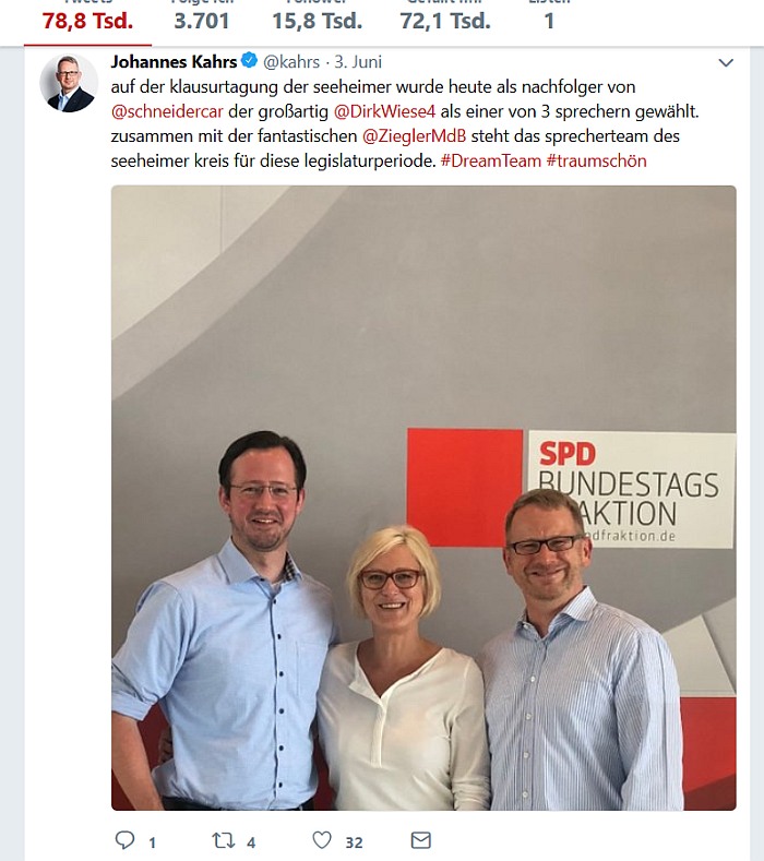 „auf der klausurtagung der seeheimer wurde heute als nachfolger von @schneidercar der großartig @DirkWiese4 als einer von 3 sprechern gewählt. zusammen mit der fantastischen @ZieglerMdB steht das sprecherteam des seeheimer kreis für diese legislaturperiode. #DreamTeam #traumschön“