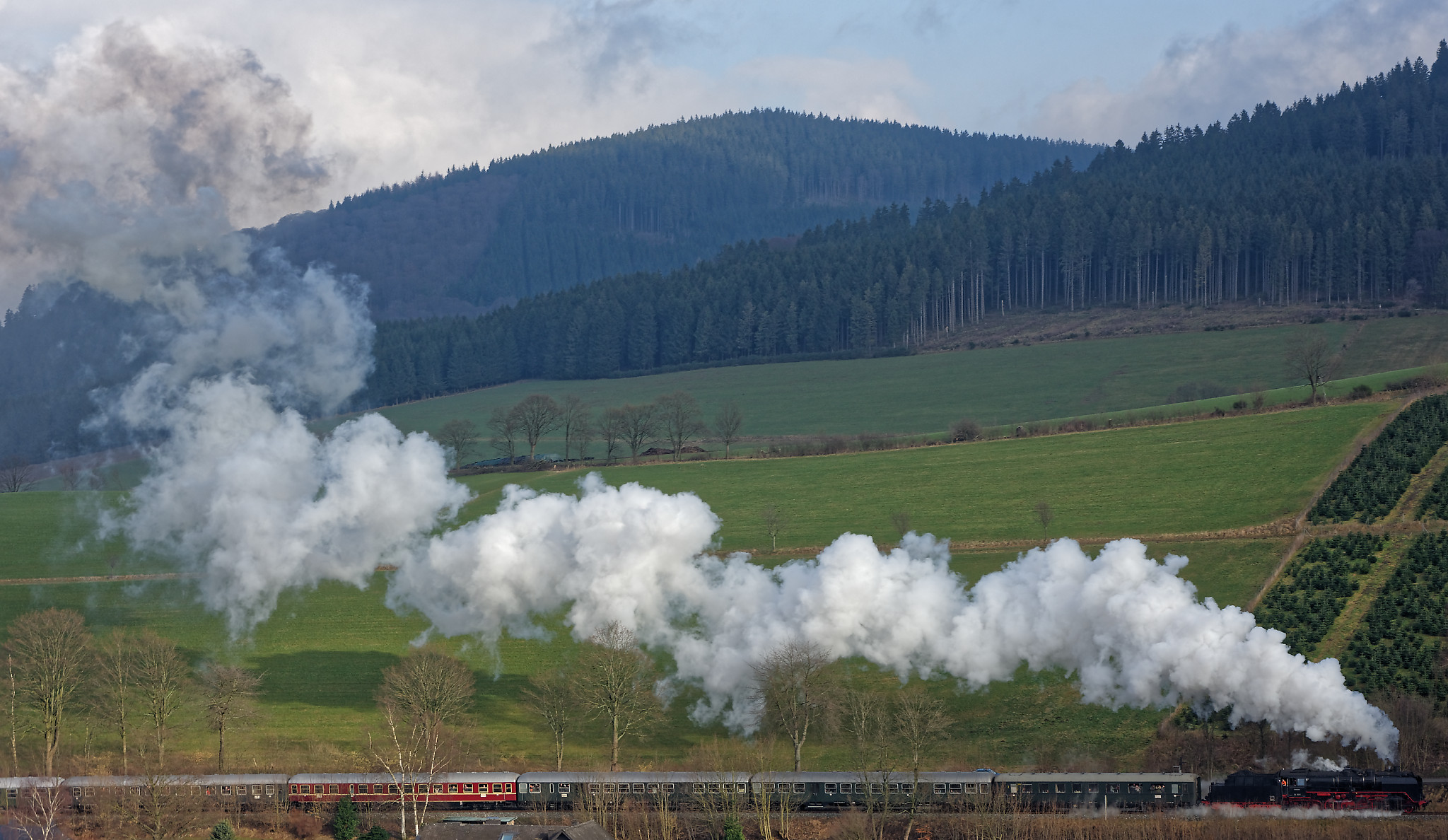 Die Eisenbahnfreunde Treysa hatten die Fahrt organisiert. Um 4:13 waren die Dampflok-Enthusiasten heute morgen (laut Plan) in den Zug gestiegen, um sich für 69 Euro (Hin- und Rückfahrt) den verrußten Dampf der Lok um die Nase wehen zu lassen. Ziel ist der Bahnhof Winterberg im Hochsauerland, der laut Plan um 12 Uhr erreicht worden ist.