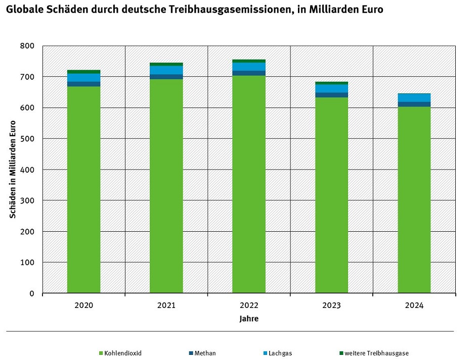 Die 2024 in Deutschland freigesetzten Treibhausgasemissionen führen nach aktuellen Modellierungen während ihrer Verweildauer in der Atmosphäre zu globalen Wohlfahrtsverlusten in Höhe von 647 Milliarden Euro, wenn man die Schäden für heutige und künftige Generationen gleichermaßen berücksichtigt.