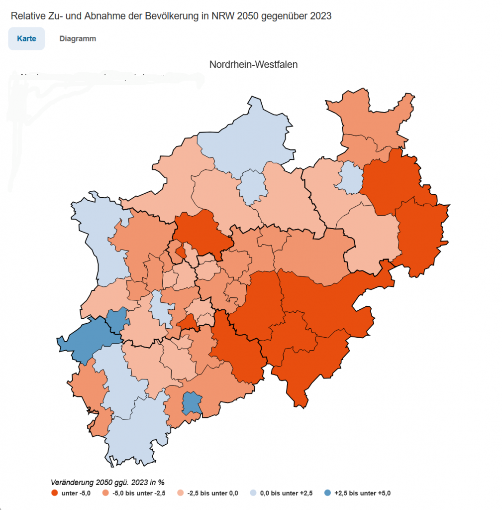 Regional sind unterschiedliche Entwicklungen zu erwarten: Für 10 kreisfreie Städte und Kreise des Landes erwarten die Statistikerinnen und Statistiker bis zum Jahr 2050 entgegen dem Landestrend eine Zunahme der Bevölkerungszahl. Der höchste Anstieg wird für den Kreis Heinsberg mit +4,7 % erwartet. Dahinter folgen die kreisfreien Städte Mönchengladbach (+4,3 %) und Bonn (+3,9 %). Auch Münster (+2,4 %) sowie Düsseldorf und der Kreis Kleve (jeweils +1,5 %) erwarten einen Bevölkerungszuwachs. Dem stehen insgesamt 43 kreisfreie Städte und Kreise (einschl. Städteregion Aachen) gegenüber, für die bis 2050 eine rückläufige Einwohnerzahl prognostiziert wird. Der höchste Rückgang zeichnet sich für den Märkischen Kreis mit -12,5 % ab. Darauf folgen der Kreis Olpe mit -12,3 %, der Hochsauerlandkreis (-9,6 %) sowie die Kreise Höxter (-9,3 %) und Siegen-Wittgenstein (-8,7 %).