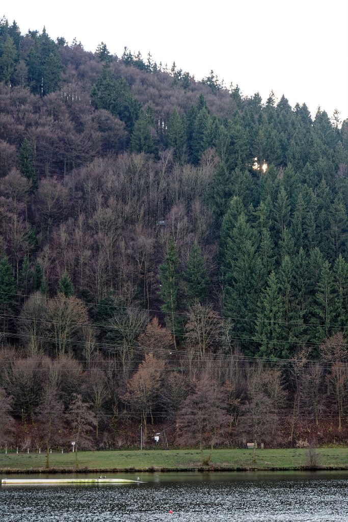 Von der anderen Seite des Hillebachsees ist der Verlauf der Schanze kaum noch zu erahnen. In der Mitte, oberhalb des grünen Ufers, ist das kleine wieße Rechteck des oben abgebildeten Schildes mit dem Skispringer obendrauf. Zwei kleine weiße Punkte (Erklärtafeln) und ein grünes Rechteck (Schanzentisch?) im Wald geben Hinweise.