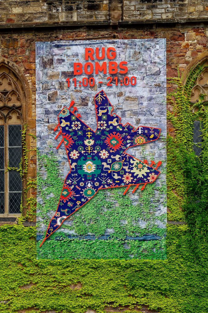Rug Bombs ist nun aber wirklich ein Kunstprojekt an der Brüderkirche. „Tanks, fighter jets, bombed-out cities, people fleeing. The subjects in RUG BOMBS are a savage depiction of the world’s current situation.“