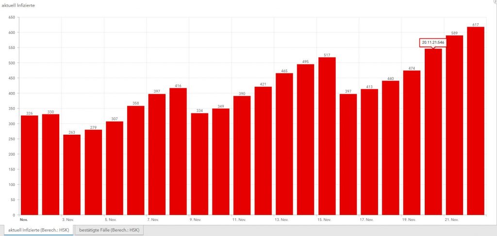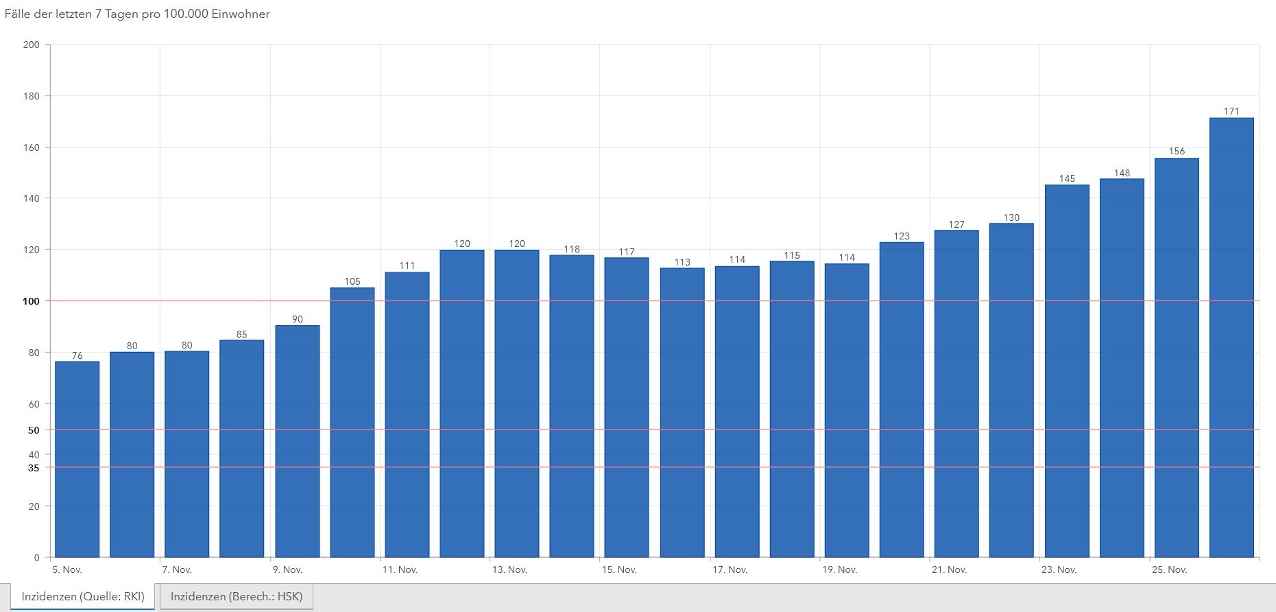 Mit Stand von Dienstag, 30. November, 9 Uhr, gibt es im Hochsauerlandkreis 45 Neuinfizierte und 177 Genesene. Die 7-Tage-Inzidenz beträgt 185,7 (Stand 30. November, 0 Uhr).