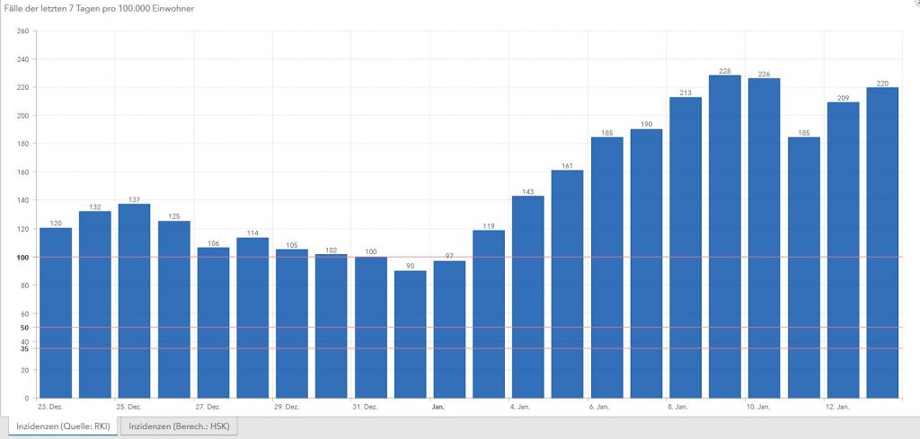 Das Gesundheitsamt des Hochsauerlandkreises vermeldet am Mittwoch, 19. Januar, 9 Uhr, kreisweit 161 Neuinfizierte und 147 Genesene. Die 7-Tage-Inzidenz beträgt 358,6 (Stand 19. Januar, 0 Uhr). Hinweis: Aufgrund eines technischen Problems beim Landeszentrum Gesundheit NRW konnten die übermittelten Daten am Dienstagabend nicht eingelesen werden, nach eigenen Berechnungen liegt die Inzidenz bei 379,9.