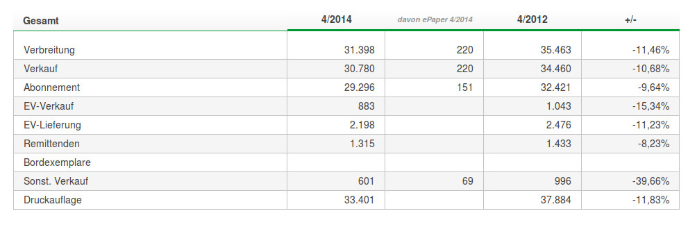 Die Spalte mit dem ePaper darf nicht aufgerechnet werden, sondern ist in den Auflagen enthalten. Das ePaper kannibalisiert gewissermaßen einen Teil der Druckauflage.