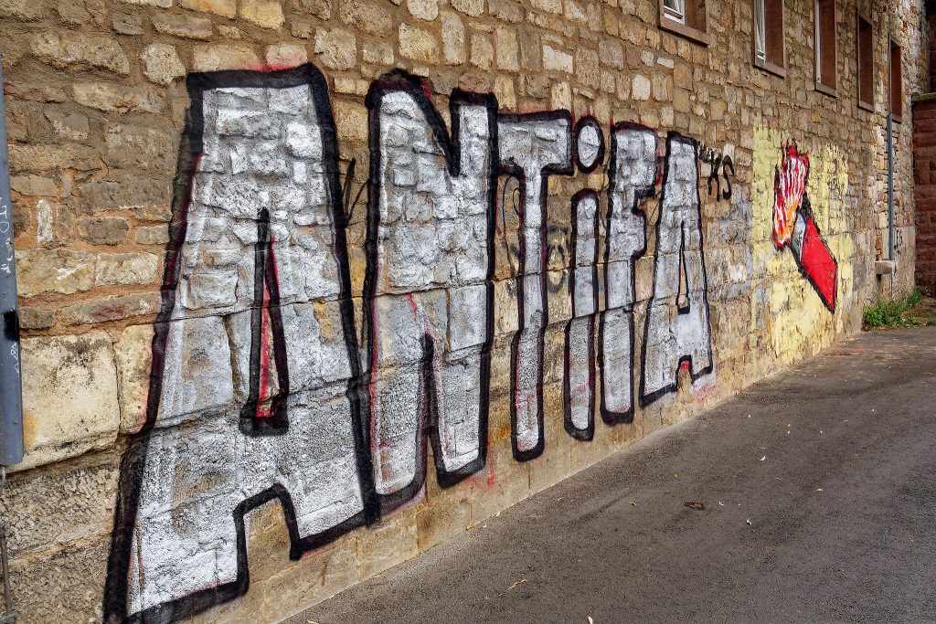 Während ich das Antifa-Graffito auf der anderen Seite der Fulda betrachtete, kreiste sehr lange ein Polizeihubschrauber über uns. Um mich herum taten alle das Gleiche wie ich, nämlich den Hubschrauber fotografieren und filmen.