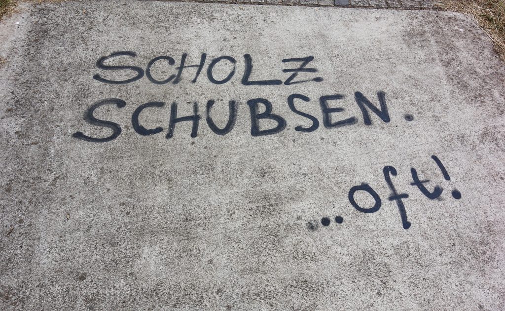 Macht Olaf Scholz den Eindruck, dass man ihn schubsen könne? Beim G20-Gipfel in Hamburg ging die Gewalt sprichwörtlich vom Staate aus. Bei Aussagen von Scholz zum CumEx-Skandal führten Versuche ihn zur Aussage zu schubsen zu Gedächtnisverlusten. Schubsen scheint mir ein frommer Wunsch und keine realistische Handlungsalternative (zu was eigentlich?) zu sein.