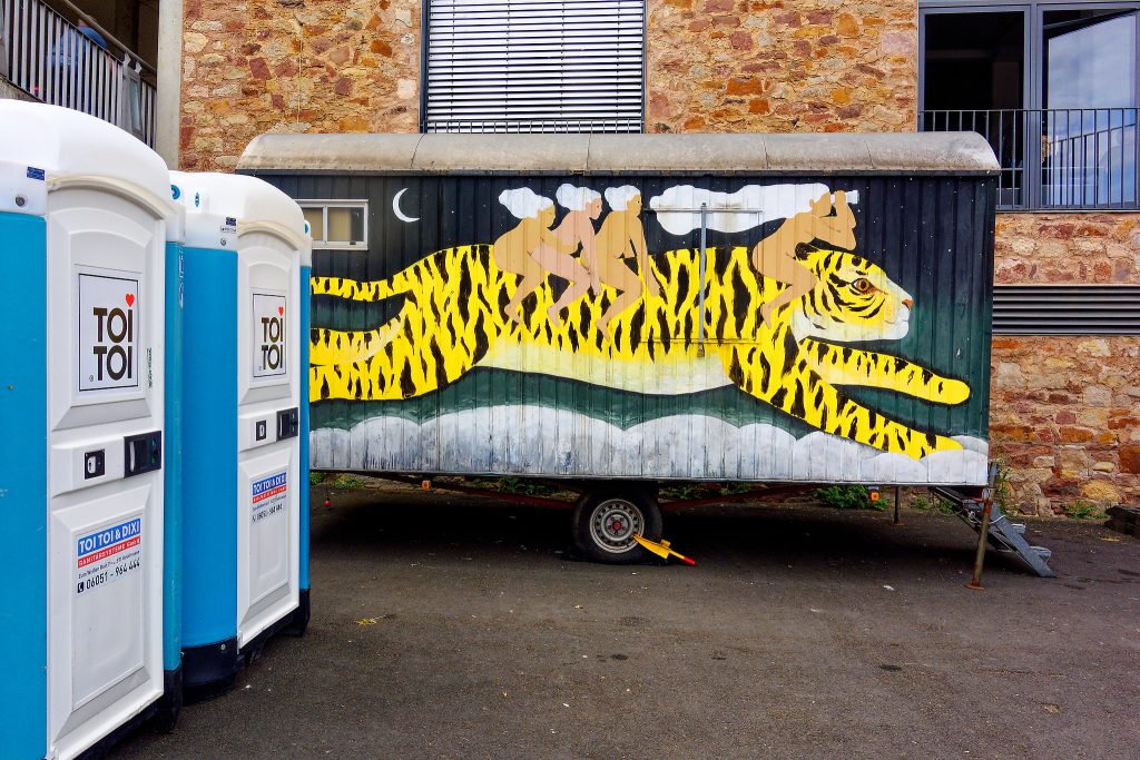 Der Ritt auf dem Tiger ist vielleicht Teil der öffentlichen Documenta, aber mit Bestimmtheit weiß ich es nicht. Genügend Metaphorik ist jedenfalls auf dem Bauwagen vorhanden.
