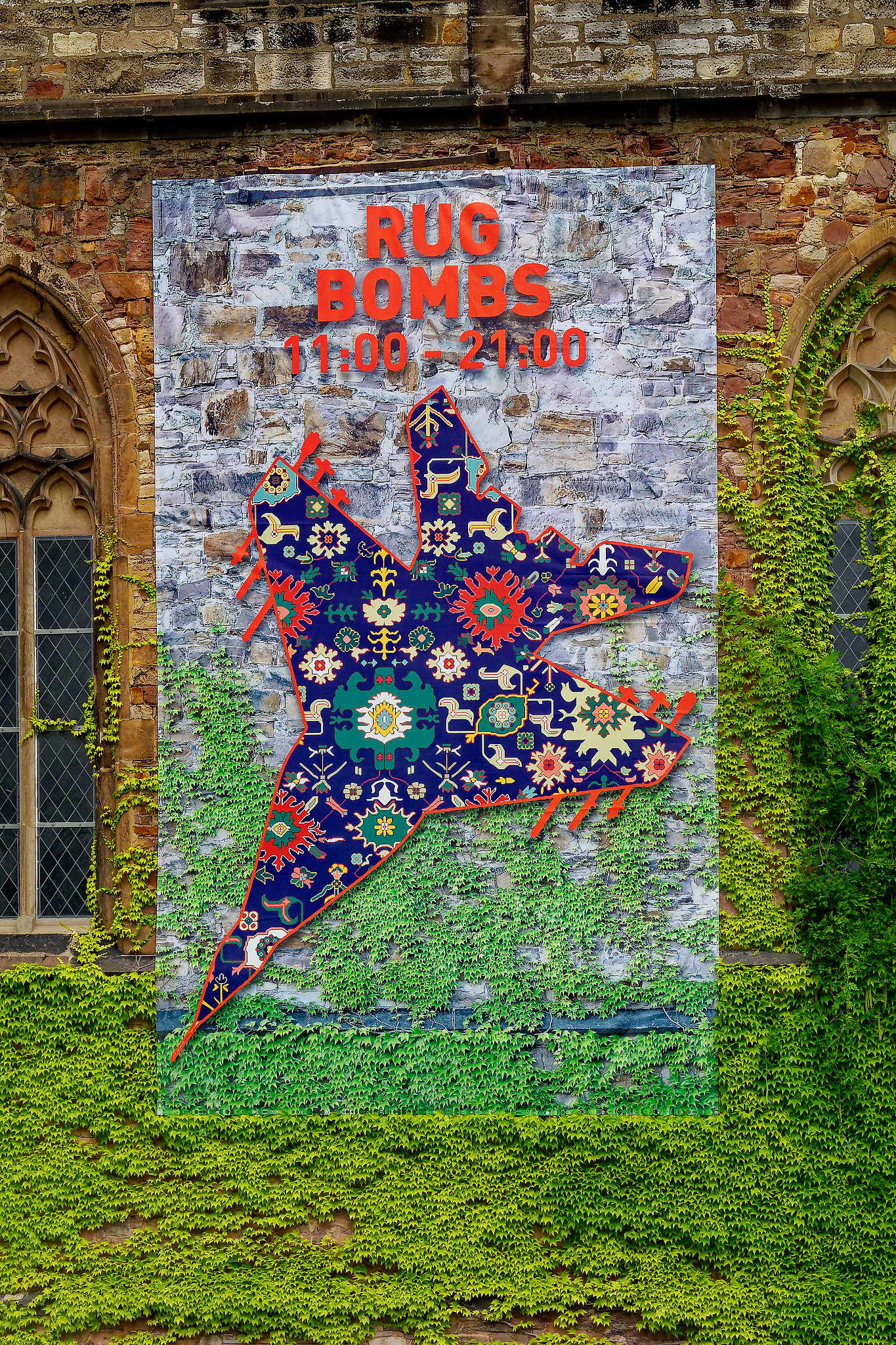 Rug Bombs ist nun aber wirklich ein Kunstprojekt an der Brüderkirche. „Tanks, fighter jets, bombed-out cities, people fleeing. The subjects in RUG BOMBS are a savage depiction of the world’s current situation.“