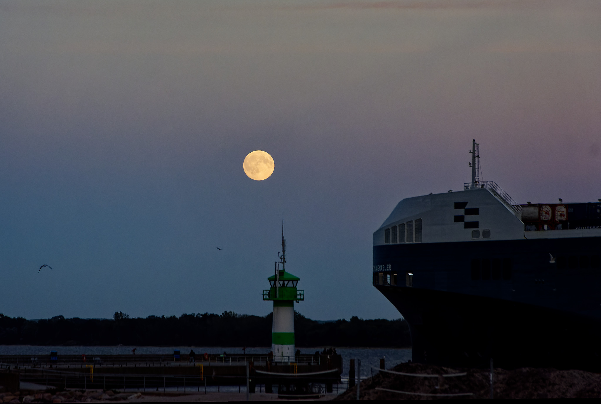Als sich Schiff und Mond am Leuchtturm trafen, habe ich ein letztes Foto geknipst.
